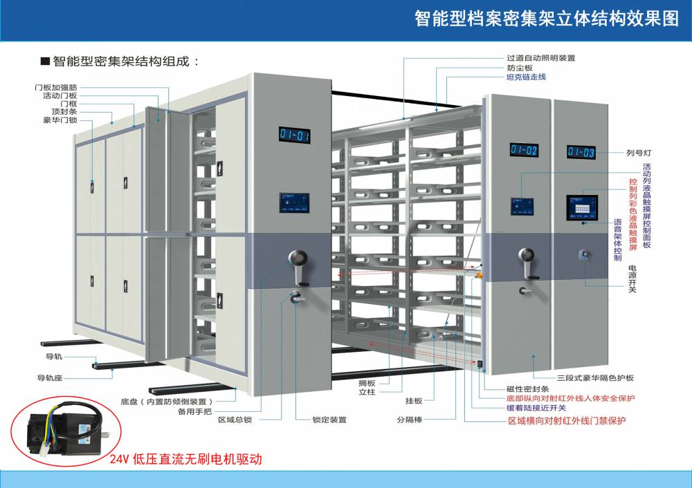 密集架可单列或多列一起在导轨上行走,每列具有手刹制动装置(自锁柄)。 自锁柄在OFF位置时,架体不能移动,在ON位置时,架体可移动,每列架体的侧面板上有标签框,移动列底务上有防倒装置,每个组合箱体的前后各一列装有总锁,用于整体的锁 闭,起到保密作用,导轨的端部安装限位装置。 3、密集架的锁定: 逆时针方向转动自锁柄到ON位置,架体自锁被解除。 摇动手柄架体可行走。